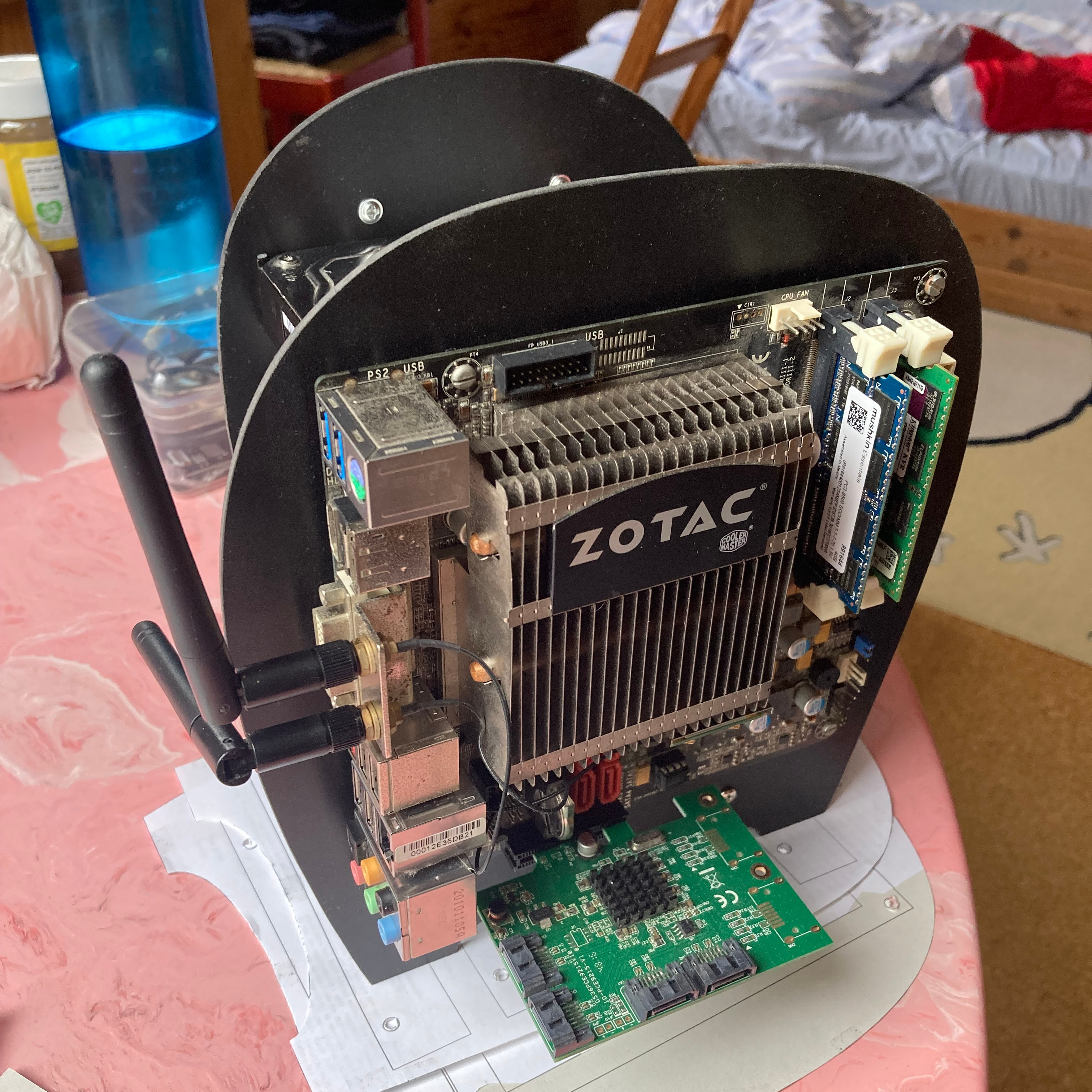 There are still some drawbacks which I might eventually want to improve on in a version 2: The green SATA controller card is only held by its PCIe slot, wobbly, and too exposed. I'm worried about eventually breaking it off, but I haven't yet found a nice way of safely attaching it to the plate or mainboard. And when all drives are active (should be rare during regular use), heat does accumulate in the stack and the top drives can become unacceptably hot. Not wanting to add a fan, mounting the drives vertically should enable the natural airflow to help.